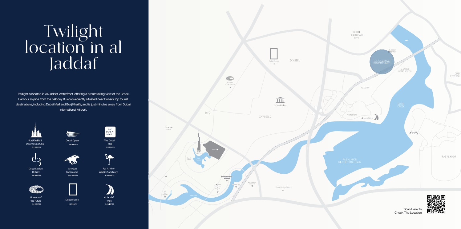 The location of Twilight in the culturally rich Al Jaddaf area offers beautiful views of Dubai Creek from every home. This prime location provides easy access to major landmarks, schools, healthcare facilities, and retail centers. It is also well-connected to Downtown Dubai, Dubai Festival City, and Dubai Marina.