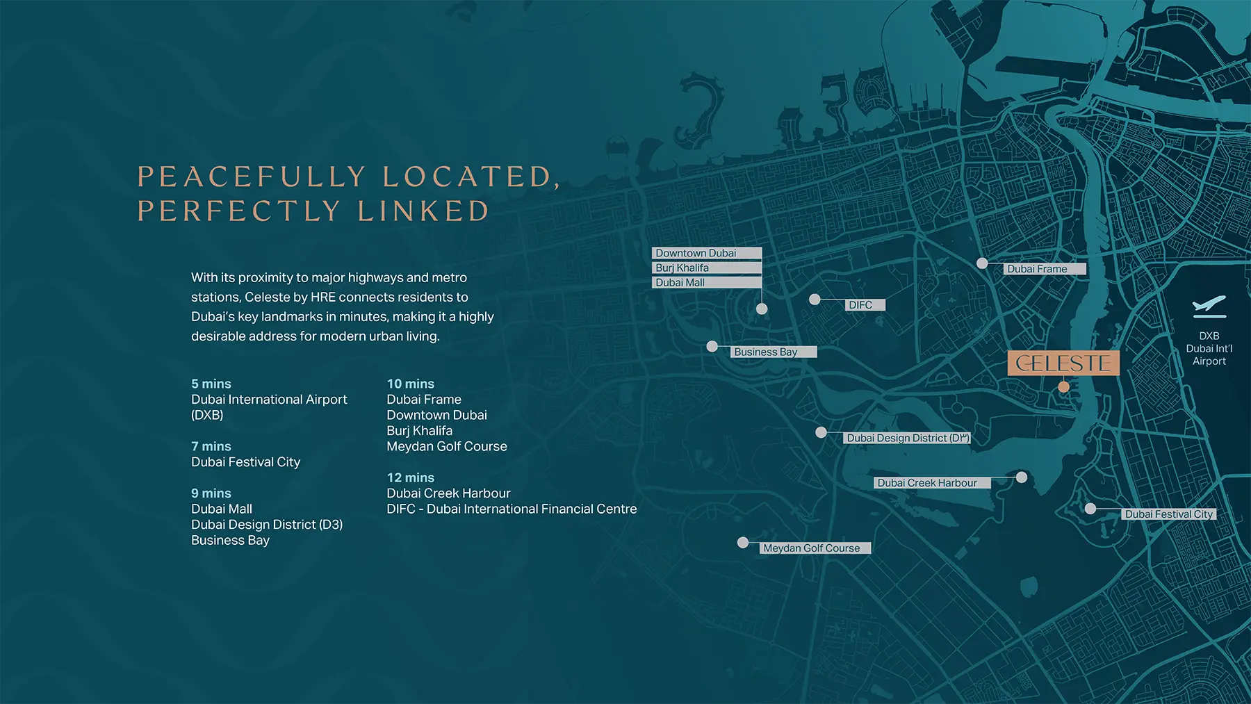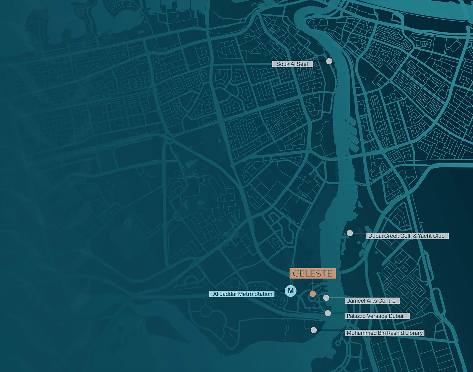 Celeste Residence stands in the upscale Al Jaddaf district in Dubai, where its residents experience direct access to the exciting way of life. People know Al Jaddaf for both its historical past and modern progress while staying true to its roots. The central area connects residents directly to Downtown Dubai, Business Bay, and Dubai International Airport while also providing them a premium lifestyle. The area brings together natural wonders and urban benefits. Residents can visit both the Dubai Creek and Wildlife Sanctuary and enjoy access to all amenities in their neighbourhood. The area provides residents with every convenience they need including multiple dining spots, shopping centers, and fun activities.
