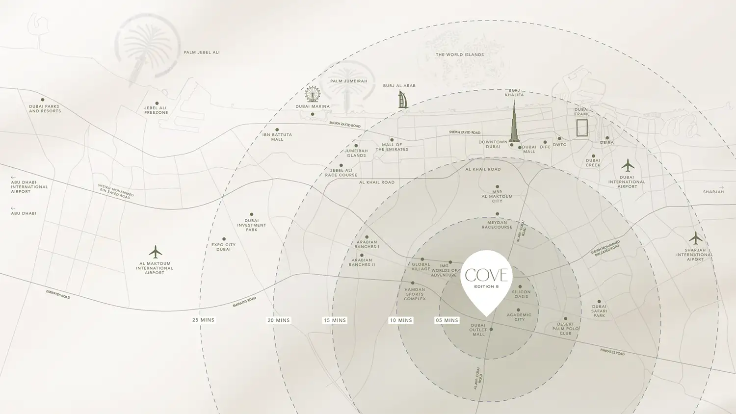 Contributing to the famous mixed-use community of (DLRC) Dubai Land Residence Complex with the contemporary and prestigious living address of Cove Edition 5. Located in nature’s flourishing heart, this property enjoys a perfect environment for families. Proximity to the schools, parks, cycling trails & walkways, it is a thriving hub planned for a balanced daily routine where retail options, supermarkets, luxury hotels, cafes, restaurants, mosques, and many essential, leisure, and entertainment common facilities are combined perfectly. The Al Ain and Emirates Roads are the prime routes that let you convey to the major famous attractions such as Global Village, Dubai Butterfly Gardens, Meydan, Business Bay, Burj Khalifa, and the international airport of the city.