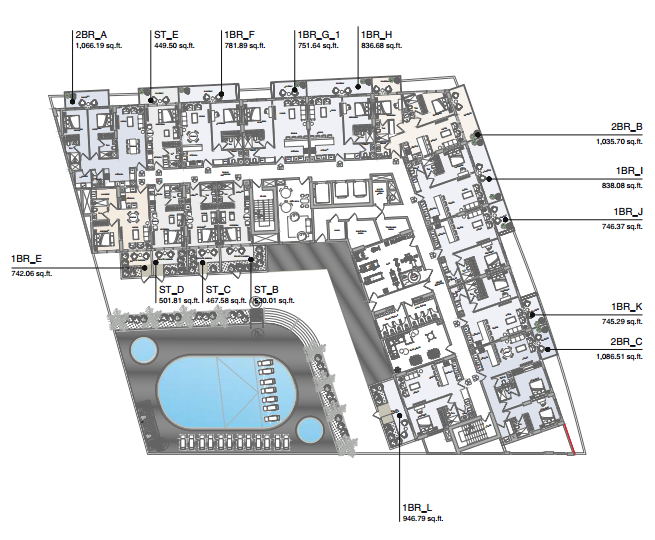 - Property Type Studio and ApartmentUnit Type Studio, 1 & 2 BedroomsSize 449.50 to 1,499.41 Sq FtAmenities Fitness Area, Children Play Room, Swimming Pool, BBQ Area and Pool Deck with Sun Loungers