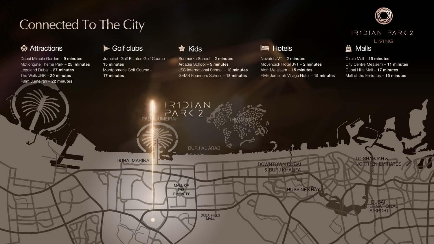 Location of IRIDIAN Park 2 by Object 1 at JVC (Jumeirah Village Circle) ensures connection to major landmarks of the city through well-maintained road and metro network. This residential project is appropriately positioned to enable easy reach to areas such as, the downtown Dubai, the Dubai International Airport, shopping malls, schools and medical facilities among others, thus increasing its habitation appeal.