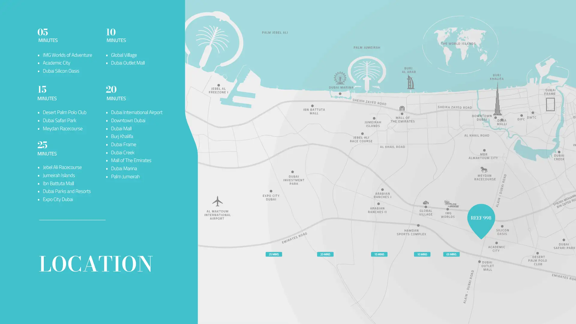 REEF 998 Residences is a reflection of modern city living and is located within the lively space of Dubai Land Residence Complex (DLRC) in the core of Dubailand. Located within a stone throw away from some of the best attractions and business centres in Dubai convenient accessibility and comfort. In terms, the locale offers residents easy access to a wide variety of lifestyle amenities, such as luxury class restaurants and dining venues, leisure retail outlets and top-rated shopping complex.