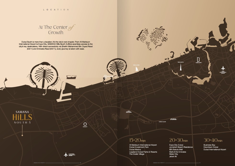 Samana Hills South 3 is located in Dubai Industrial City (also known as Dubai South), specifically in the Saih Shuaib 2 area. This location is situated in a rapidly growing part of Dubai with convenient access to business districts, transportation hubs like Al Maktoum International Airport, and other key areas like Dubai Marina via major highways.