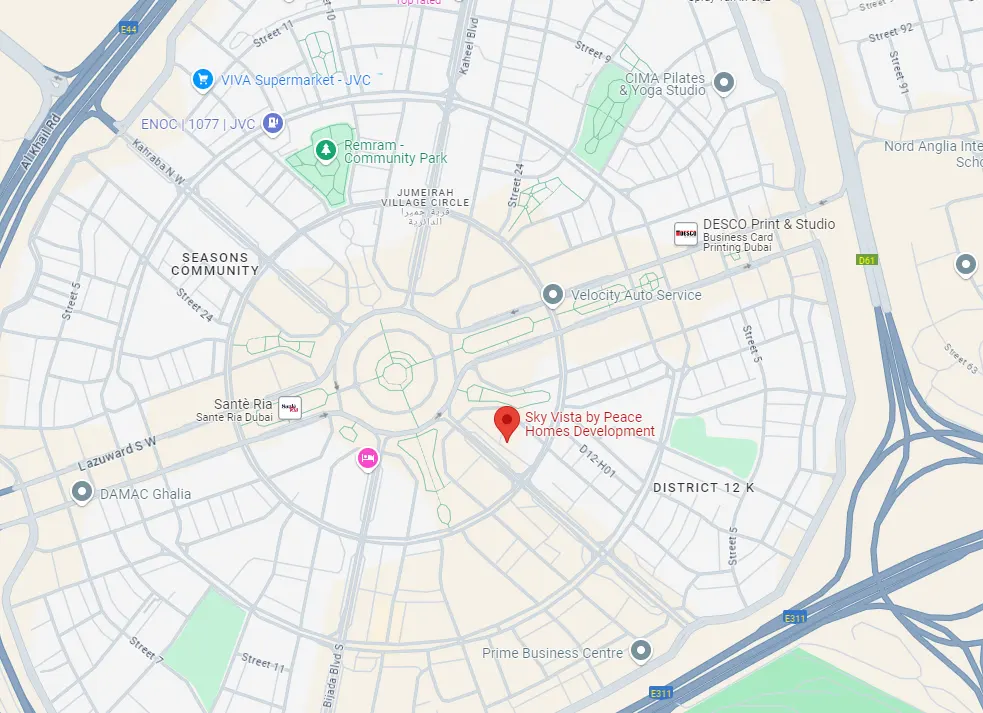 Peace Homes Sky Vista is located in the heart of Jumeirah Village Circle (JVC), one of Dubai’s most sought-after residential communities. JVC is known for its family-friendly environment, offering a perfect blend of tranquillity and urban convenience. The neighbourhood features a mix of modern homes, parks, schools, and essential amenities, making it an ideal place to live. Meanwhile the premium location here offers easy access to the key destinations in Dubai, including access to major business hubs and shopping centres.